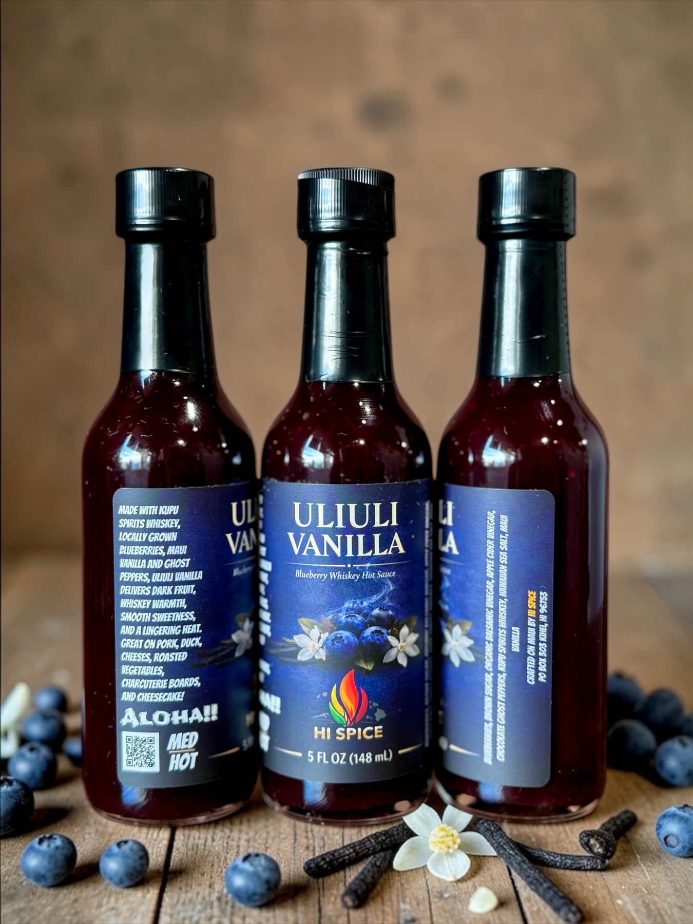 Made with Kupu Spirits whiskey, locally grown blueberries, Maui Vanilla and ghost peppers, UliUli Vanilla delivers dark fruit, whiskey warmth, smooth sweetness, and a lingering heat.
