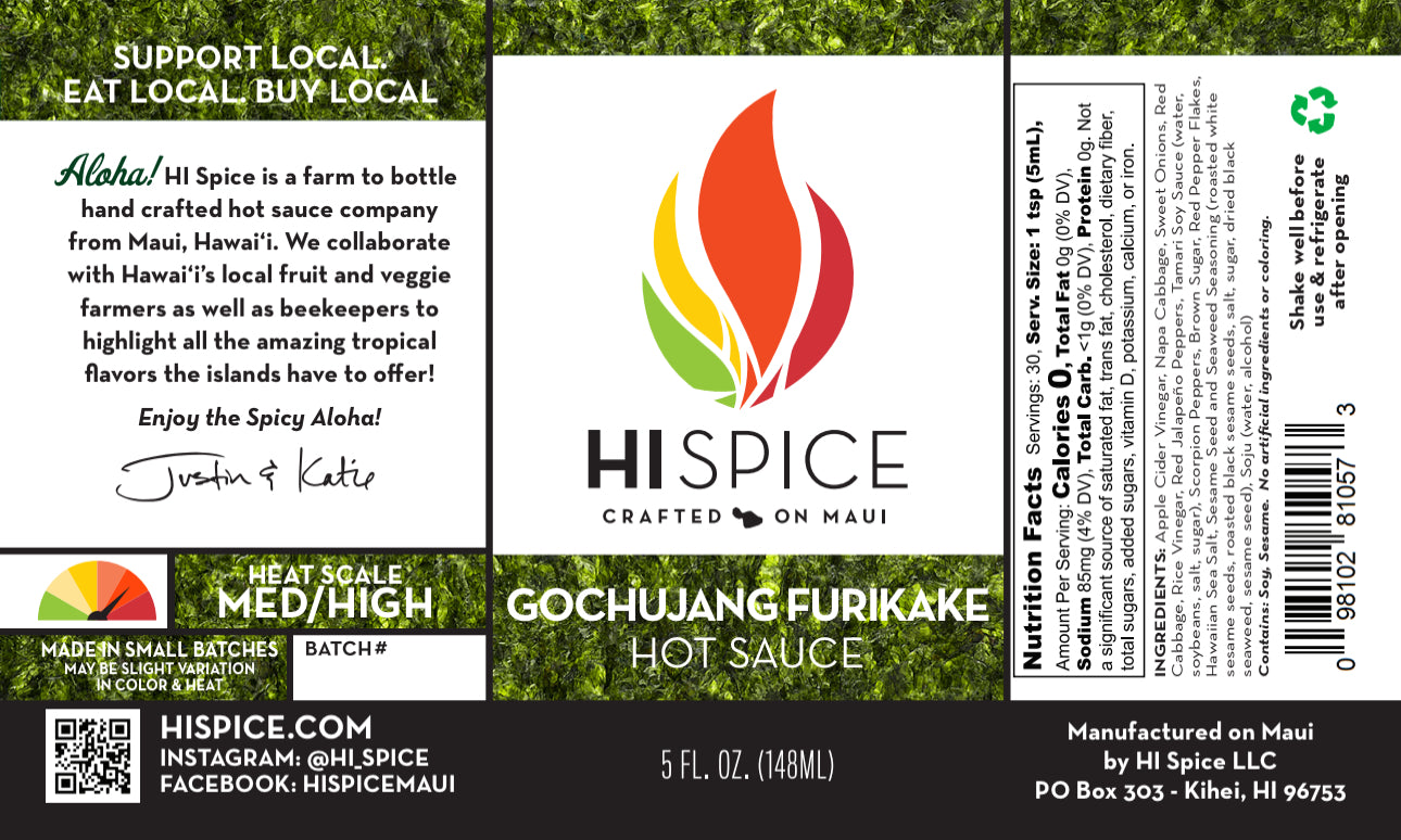 K-Pop is inspired by our love of Korean BBQ!!  Gochujang peppers, Red Jalapeños, Soju (Korean spirit made of rice, barley & tapioca), and a Hawaiian twist using Furikake and Tamari Soy Sauce give it that Umami blast your tongue craves.  This sauce is all flavor with a Medium kick.