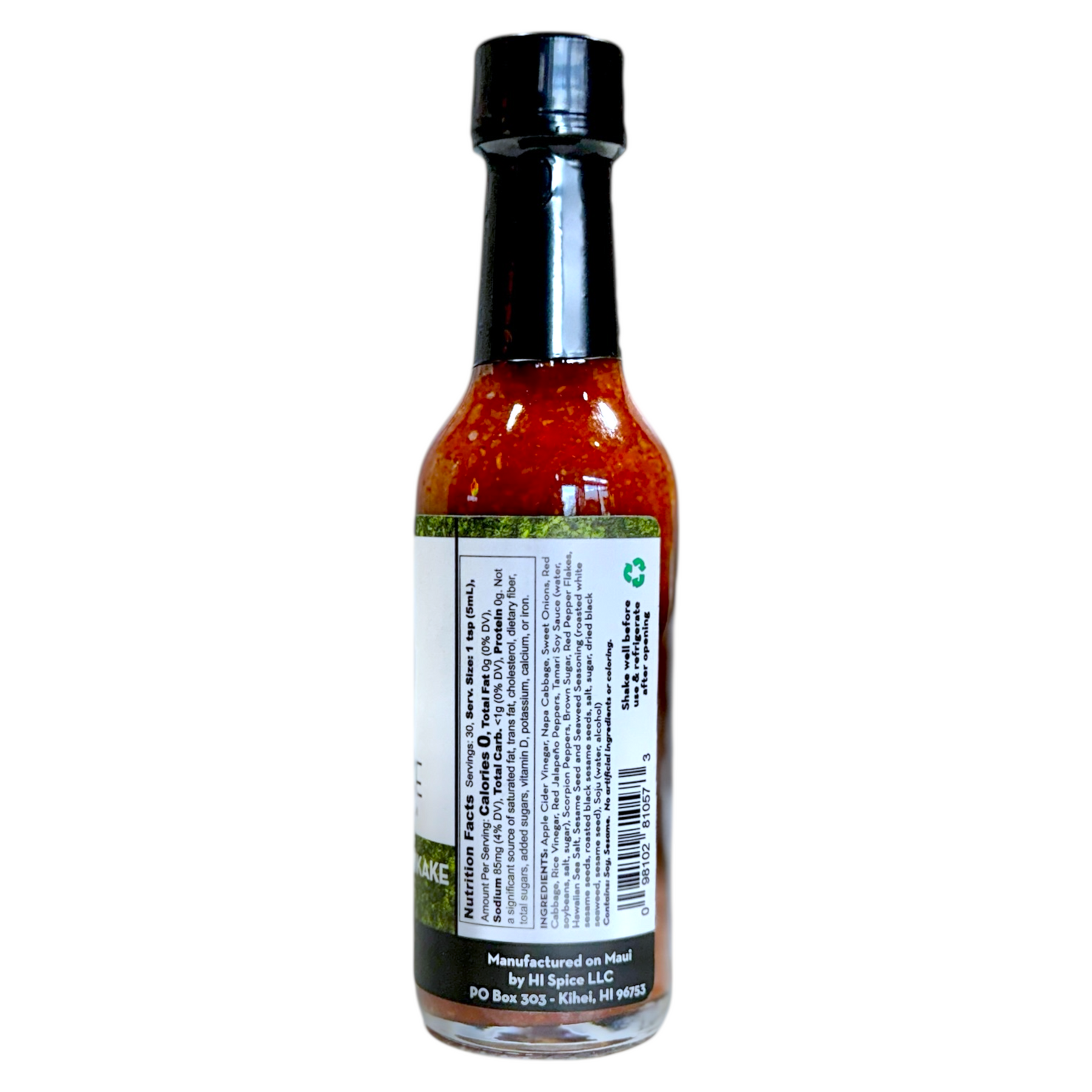 (Water, Soybeans, Salt, Sugar), Red Onions, Garlic, Hawaiian Chili Peppers, Brown Sugar, Chocolate Ghost Peppers, Black Sesame Seeds